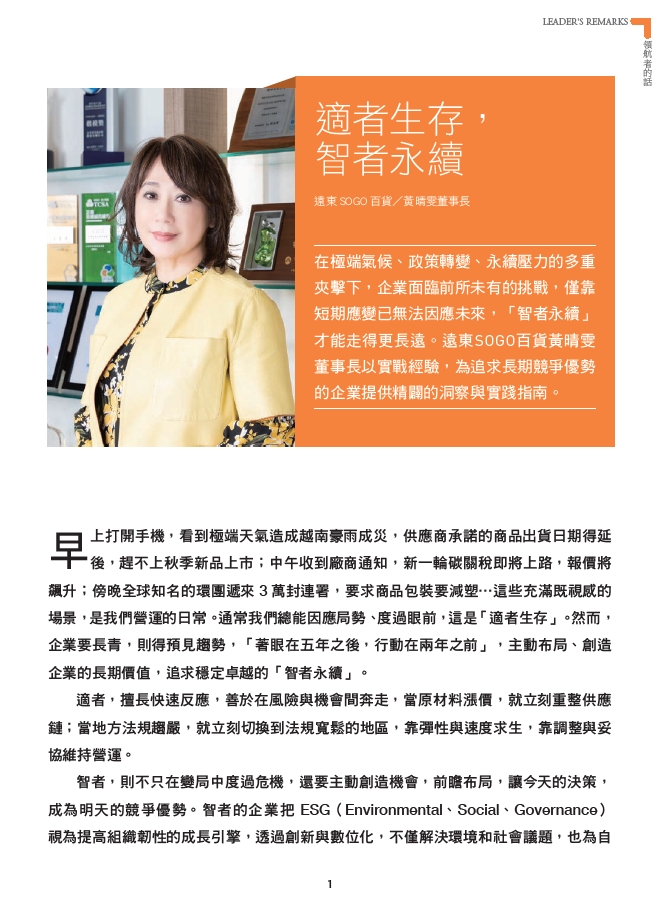 本文為2025年6月3日遠東SOGO董事長黃晴雯以「適者生存,智者永續—企業為什麼要做ESG?」為題於《女董學院2025 領導力講座》演講摘要。