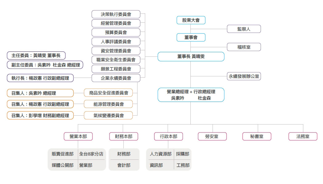 本公司於董事會下設有董事長室、營業總經理室與行政總經理室。營業總經理負責統籌前線賣場營運作業;行政總經理則管理後勤行政運作,相輔相成、分層管理,以公司營運方針為最高指導原則,創造公司最大利益。