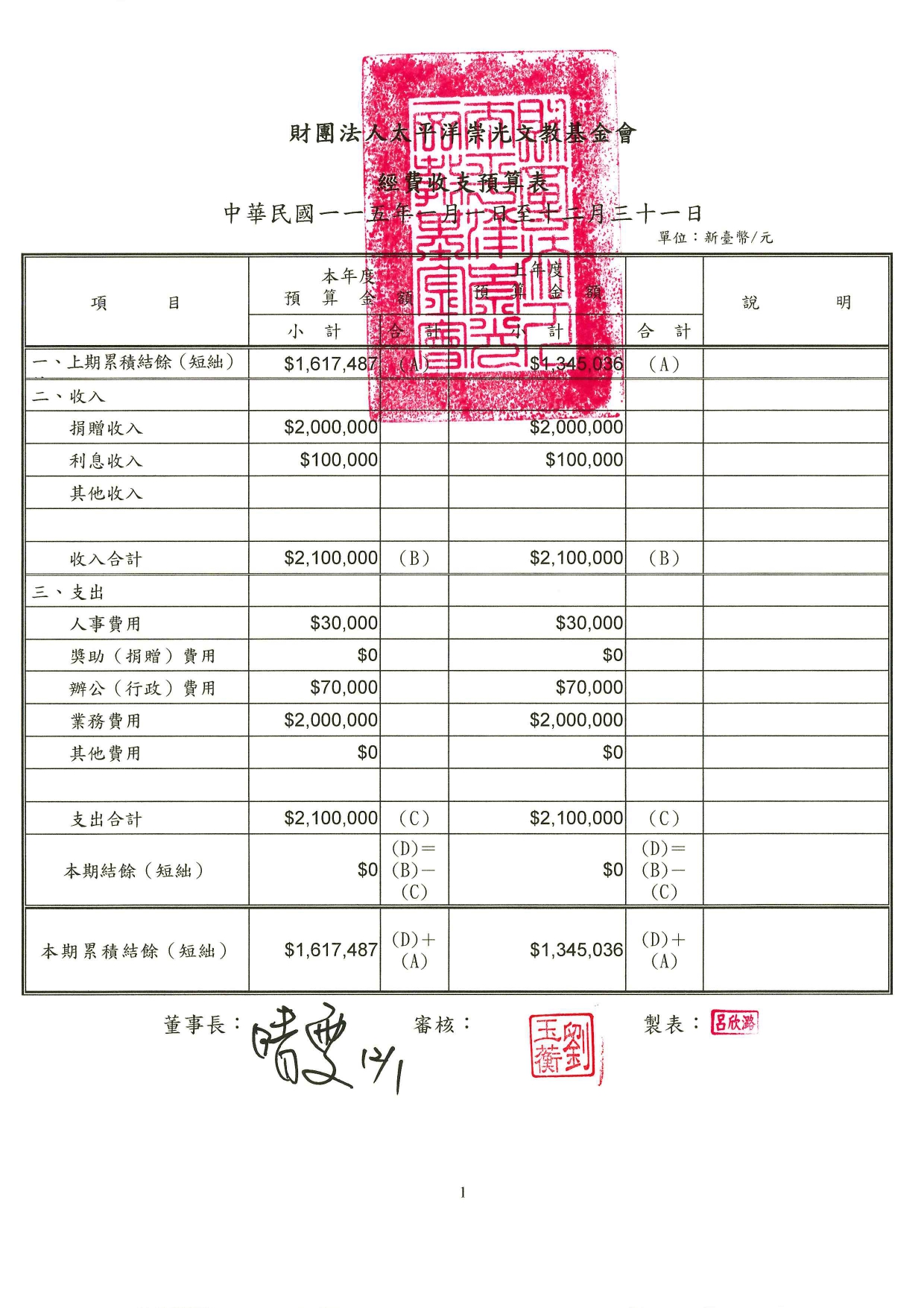本會(太平洋崇光文教基金會)115年度工作計劃及經費收支預算,經主管機關文化部通過(民國115年1月7日文綜字第1153000516號),依財團法人法第25條公布如下: