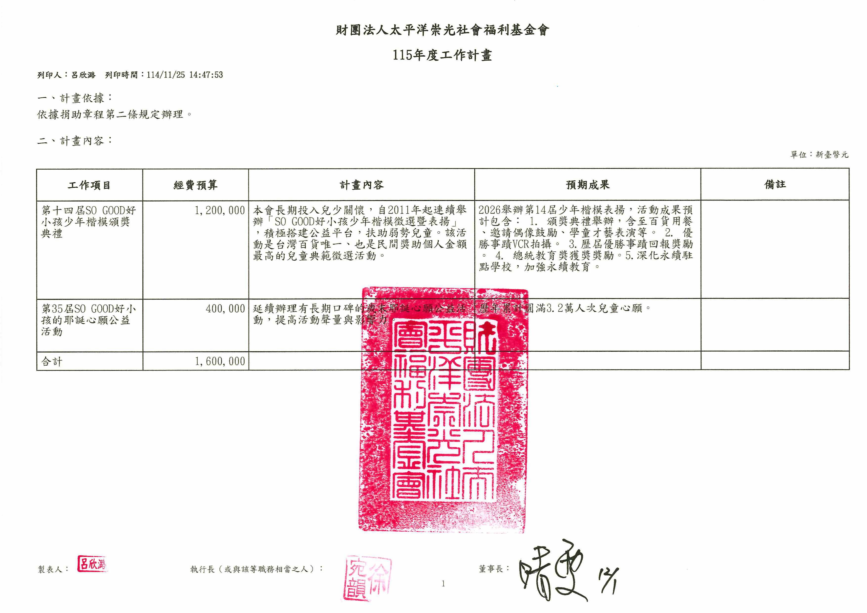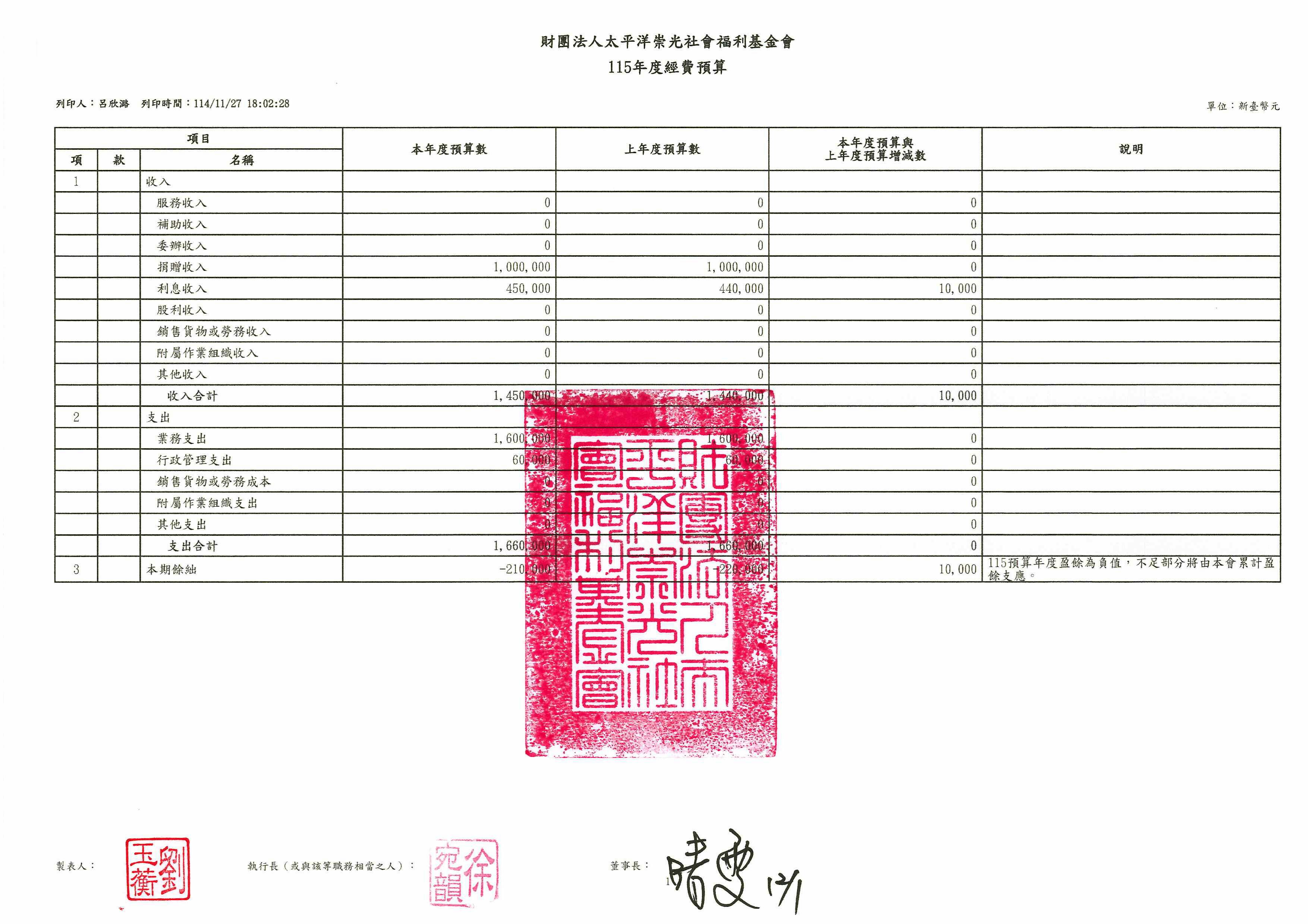 本會(太平洋崇光社會福利基金會)115年度經費預算、業務計畫業經主管機關衛福部通過(民國115年2月5日衛授家第1150101534),依財團法人法第25條第3項規定公布如下: