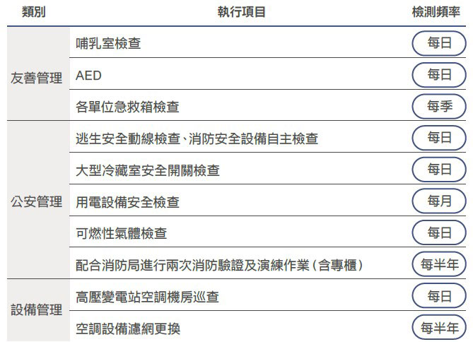 各據點備有緊急發電機,停電時可立即啟動備援,提供賣場約25%照明電力,以及電梯與樓梯間照明設備,確保顧客行動安全。各據點配合政府主管機關執行「法定傳染病防治專案」,自主管理衛生,打造安全、安心的工作與購物環境。