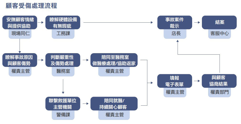 若賣場發生意外事件,由現場同仁安撫顧客,立即通報權責主管,醫務室、警備課與工務課同步展開應變。所有受傷案件皆須填報電子表單,列案管理,由客服中心追蹤,持續關心並協助,店長確認處理完善,並依據受傷類型檢討及改善。2024年發生30起,全數結案。