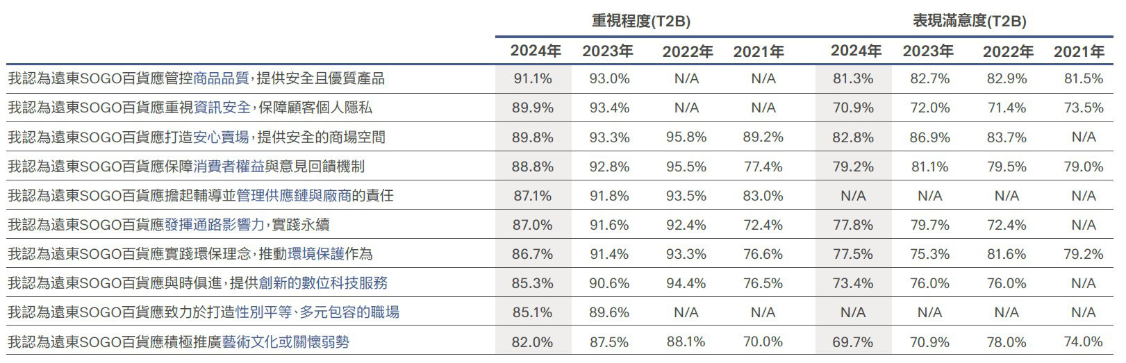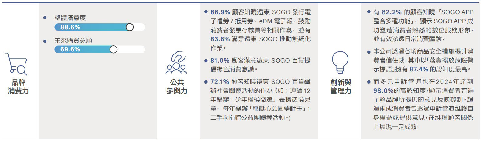 遠東SOGO秉持永續經營態度及創新精神,2024年獲88.6%消費者讚許。