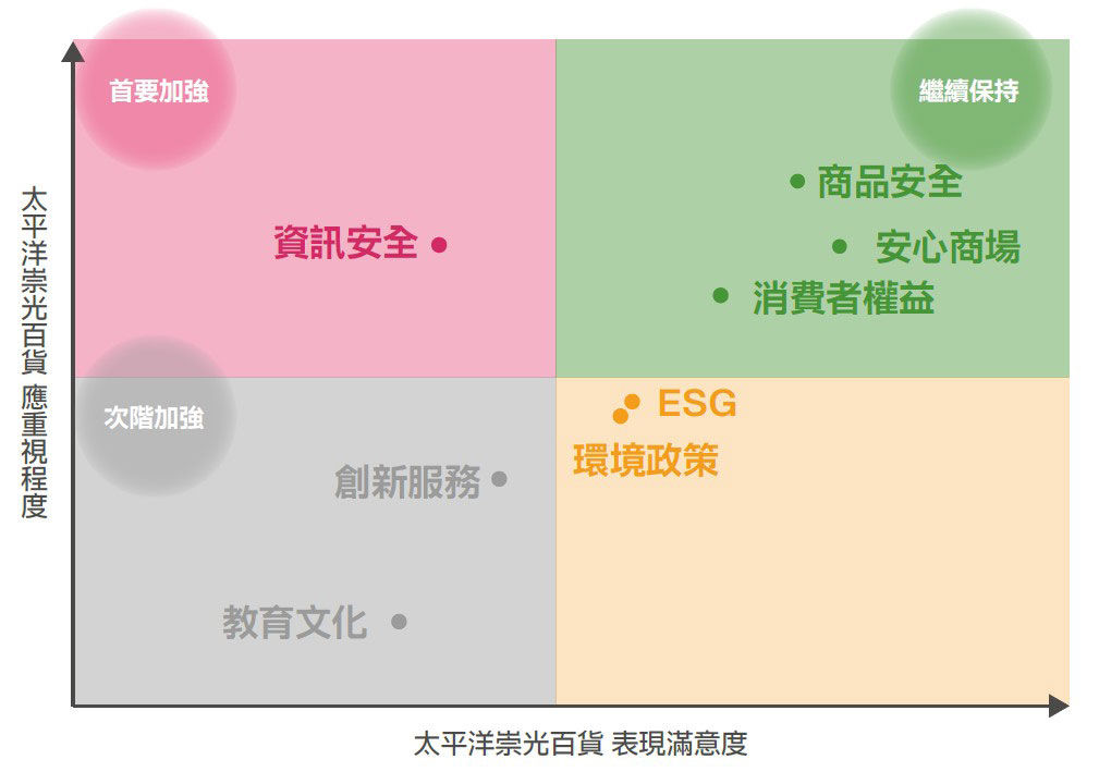 進一步分析消費者在各項議題的重視程度及評價,透過座標落點觀察,商品安全、安全賣場及消費者權益是近兩年多數消費者重視的,且為太百滿意度評價較佳的議題。然而,市場環境受數位轉型加速影響,消費者對於個資保護與交易安全的重視度同步攀升,此面向雖同樣為顧客關注的議題,但目前滿意度評價仍偏低,顯示太百在資訊安全及數位交易保障方面雖有相對應的投入,然顧客滿意度較低,顯示未來應強化宣傳與資安推廣等作為,提高顧客的認知與好感。