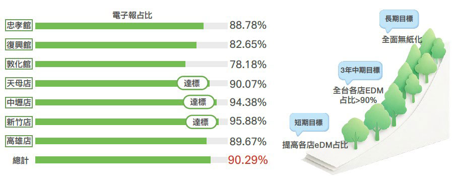 遠東SOGO為國內第一家發行電子禮券的百貨,持續推動票券電子化、整合於APP。2023年起,九成以上抵用券改發電子版,2024年贈送電子抵用券的活動數增加三成,金額大幅成長125%,加上即享券、電子禮商券金額皆成長,電子券發行金額達73.3億元,年增100%,占比超過六成五,十年累計省紙量高度達17.64座玉山;其餘三成五為因應企業禮品需求而發行的紙本禮券,自2023年10月起,率台灣百貨之先,全數採FSC永續森林認證紙材製作。