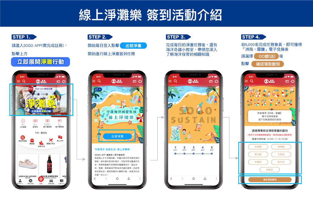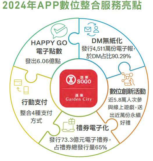APP整合線上DM、線上購物、累積點數、點數換購物金、行動支付、來店禮、贈獎活動、餐廳訂候位、美食外送、停車服務等十項功能,減少紙本印刷、節省人力成本,符合行動永續精神,也節省75%以上交易時間。為提升顧客黏著度,每年兩次SOGO Sustain檔期皆推出APP小遊戲,簽到五天即可兌換永續小禮,使顧客透過遊戲接觸並於生活實踐永續。2024年4月為淨灘樂,兌換洲南鹽場霜鹽,10月步步健走綠生活,送瑪利亞基金會成立社企品牌「Merry Young快樂襪」的寶特瓶紗襪。