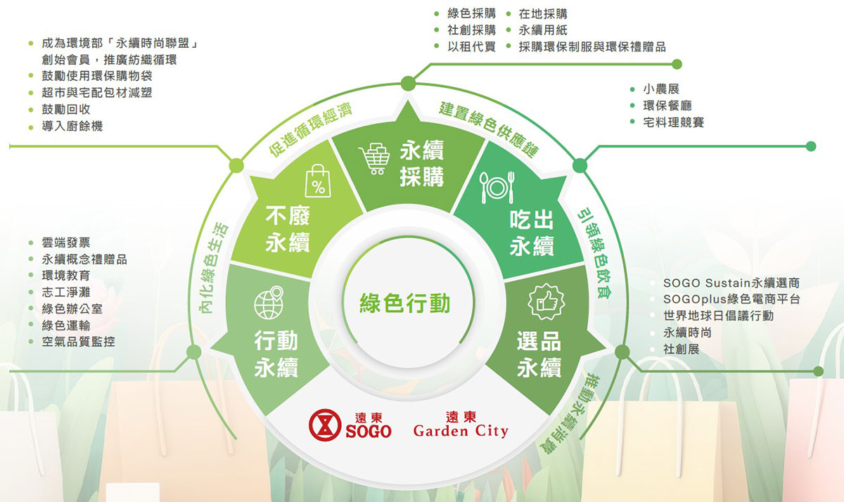遠東SOGO結合行銷創意與通路特性,將永續消費、低碳生活等概念融入組織營運與服務流程,透過「永續採購」、「吃出永續」、「選品永續」、「行動永續」、「不廢永續」5大構面設計永續消費旅程。