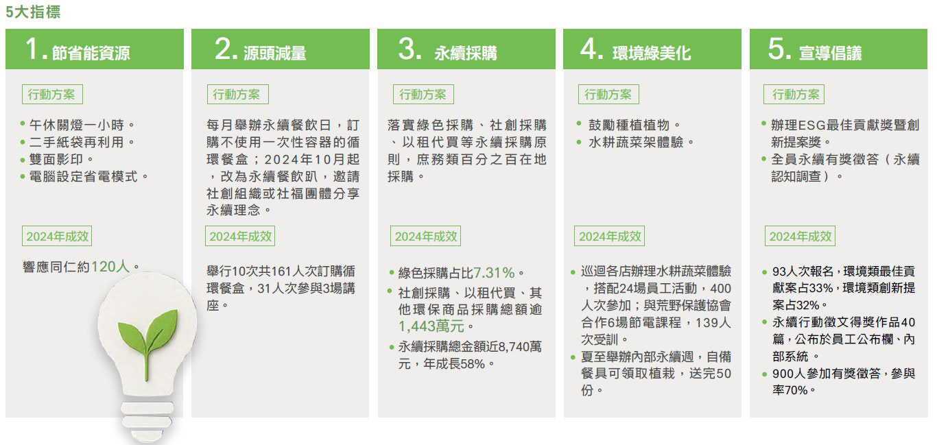禮贈品、異業合作等優先選擇社創團隊之產品與服務,獲經濟部中小企業處Buying Power貳獎肯定;硬體設備如事務機、入金機、主管公務車為以租代買。整體永續採購金額近8,788萬元,年成長59%。