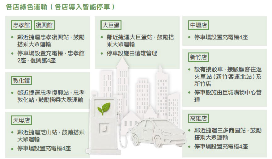 本公司積極佈局綠色運輸,全台導入智能停車系統,減少取票、停車時間,優化購物旅程的同時,年減逾30公噸碳排及近130萬張紙本停車券;設置18座電動車充電樁,手機QR-Code隨掃隨充,並整合便利支付、客服專線、監管及障礙報修等服務;宅配服務與國內首家取得「產品減碳標籤」之物流業者合作,降低產品配送過程產生的碳足跡。公務車以租代買,車齡皆在10年內,共12台租賃車作為高階主管座車與貨運用車,其中一台為油電混合,減少空污排放,並提升能源使用效率。公務車租賃屆期時,將逐步導入綠色運具。