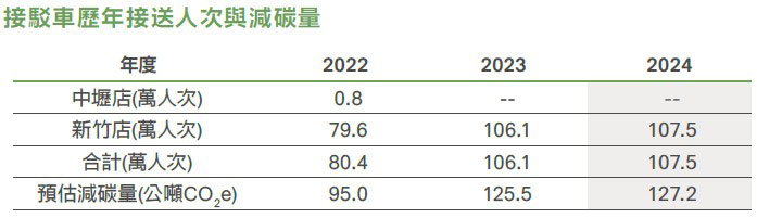本公司多數據點位於交通便利處,鼓勵搭乘大眾運輸,針對非座落於交通樞紐的新竹店設置免費接駁車,供員工通勤與顧客搭乘,主要往返火車站。2024年107.5萬人次搭乘,減碳127.2噸。
