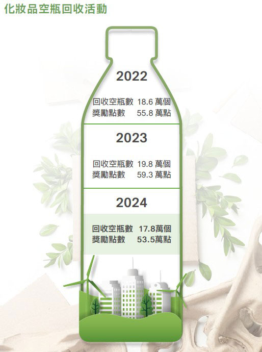 遠東SOGO近年化妝品類業種營收約占總營收超過一成,僅次於精品,製造的空瓶垃圾可觀,故全台推出「愛美麗更愛地球.化妝品空瓶回收」活動,持化妝品或香氛正貨空瓶至專櫃回收,每個可獲HAPPY GO 3點。此外,天母及新竹店鼓勵回收廢電池,2024年共回收5.3萬顆,送出2.6萬點。