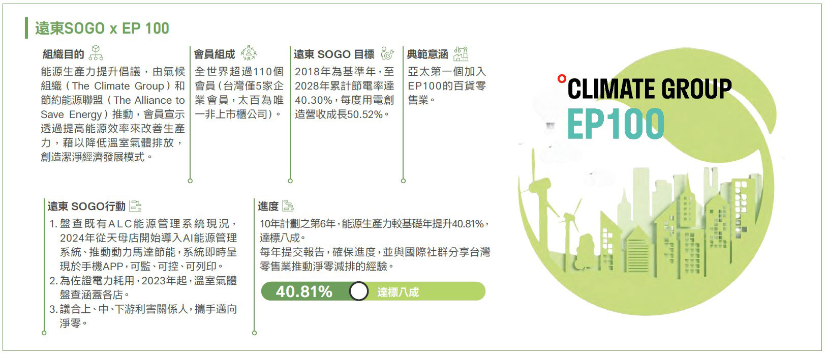 為加速實現節能減碳願景,遠東SOGO於2022年成為EP100國際倡議(Energy Productivity100)亞太第一個百貨零售業會員,承諾以2018為基準年,預計至2028年累計節電率達40.30%,能源生產力(每度用電創造營收)成長50.52%。