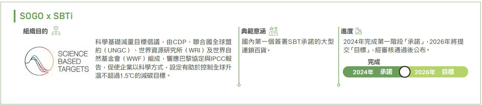 呼應淨零,遠東SOG發展三大永續策略——「節能減排」、「永續消費」、「循環商模」,由百貨核心職能出發,打造低碳通路。遠東SOGO領先法規一年,於2021年永續報告書首度導入「氣候相關財務揭露建議」(Task Force on ClimateRelated Financial Disclosures, TCFD),鑑別氣候風險議題;2022年成立氣候變遷委員會,奠定氣候治理機制,逐年提高風險揭露程度;2023年成立永續發展辦公室,直屬董事長管理,專責推動企業永續,並正式成為台灣百貨第一個TCFD supporter。