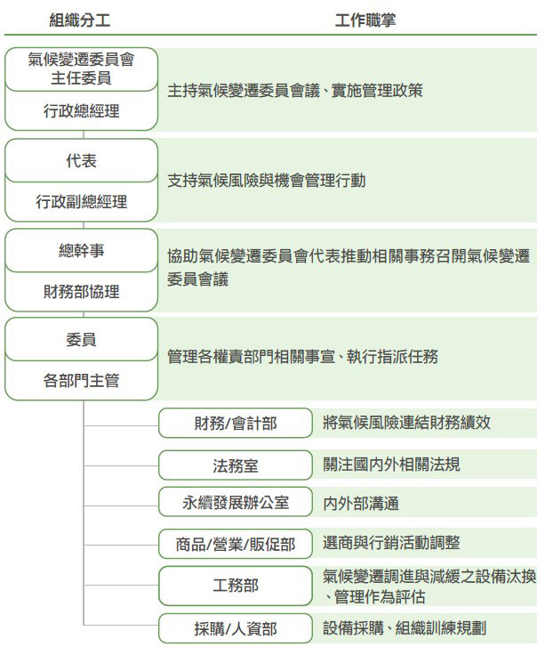 ESG委員會下設「能源管理委員會」,由行政總經理擔任主任委員、簽署能源政策,推動與協調能源管理制度,帶動全公司攜手利害關係人,降低能資源消耗。