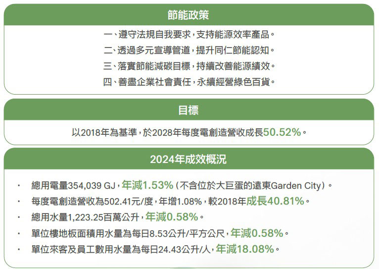 本公司於2017年以台北店敦化館為標的,導入ISO 50001能源管理系統,並通過查證,為台灣連鎖百貨第一家,目前各店皆以此精神控管能源,並每月召開工務會議,以燈號標示管理機制,審視各店能源使用情形;透過測量與監督,找出現階段可改善之處,同時管理未來能源供應的相關風險,藉此提升能源效率,降低經營成本及減少溫室氣體排放。為評估能源管理績效,本公司積極參與遠東集團每季舉行的「能源使用效率競賽」,並要求各部門主管參加永續委員會例會,以了解目前公司最新ESG相關政策與計畫,各部門共同為永續目標努力。