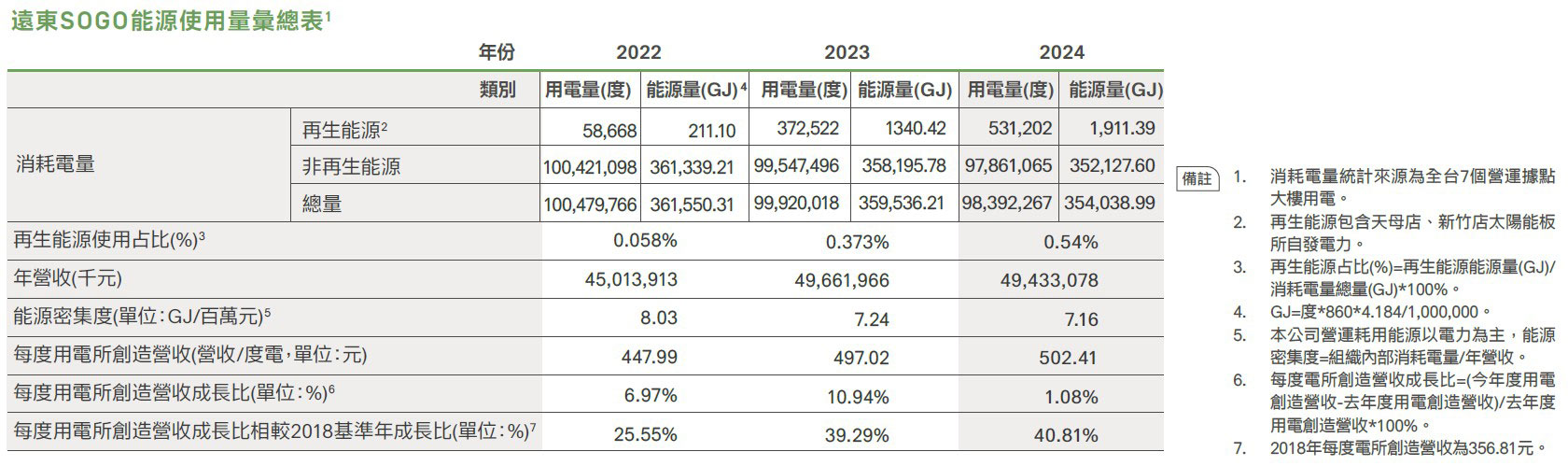 全台各營業據點能源耗用以外購電力為主,搭配天母店與新竹店自發自用太陽能電力,無其他能源耗用,持續透過各項節能措施,提升能源使用效率。2024年遠東SOGO來客數較2023年增加21.37%,但用電度數98,392,267度(含外購電力及再生能源電力),轉換成能源消耗量為354,039GJ,與去年度相比,反減1.53%。在用電強度(能源使用效率)方面,遠東SOGO每度電創造營收為502.41元/度,較2023年成長1.08%,與2018年基準年相較,提高40.81%。