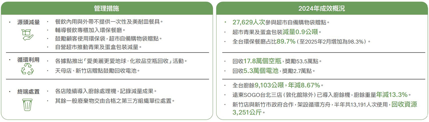 提升回收率不但可使垃圾減量,降低處理成本,亦可延長掩埋場及焚化廠的使用年限。2024年遠東SOGO資源回收率達5.94%,高於2023年的5.81%。