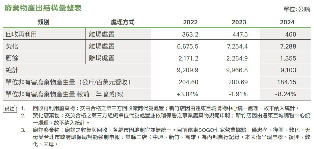 2024年遠東SOGO全台各店產出廢棄物總計9,103公噸,包含回收廢棄物460公噸,焚化廢棄物7,288公噸,廚餘 1,355公噸。百貨零售業之廢棄物產生結構,與來客數變動高度相關,2024年遠東SOGO來客數較2023年成長21.37%,廢棄物產出總量減少8.67%,單位非有害廢棄物產生量下降8.25%。