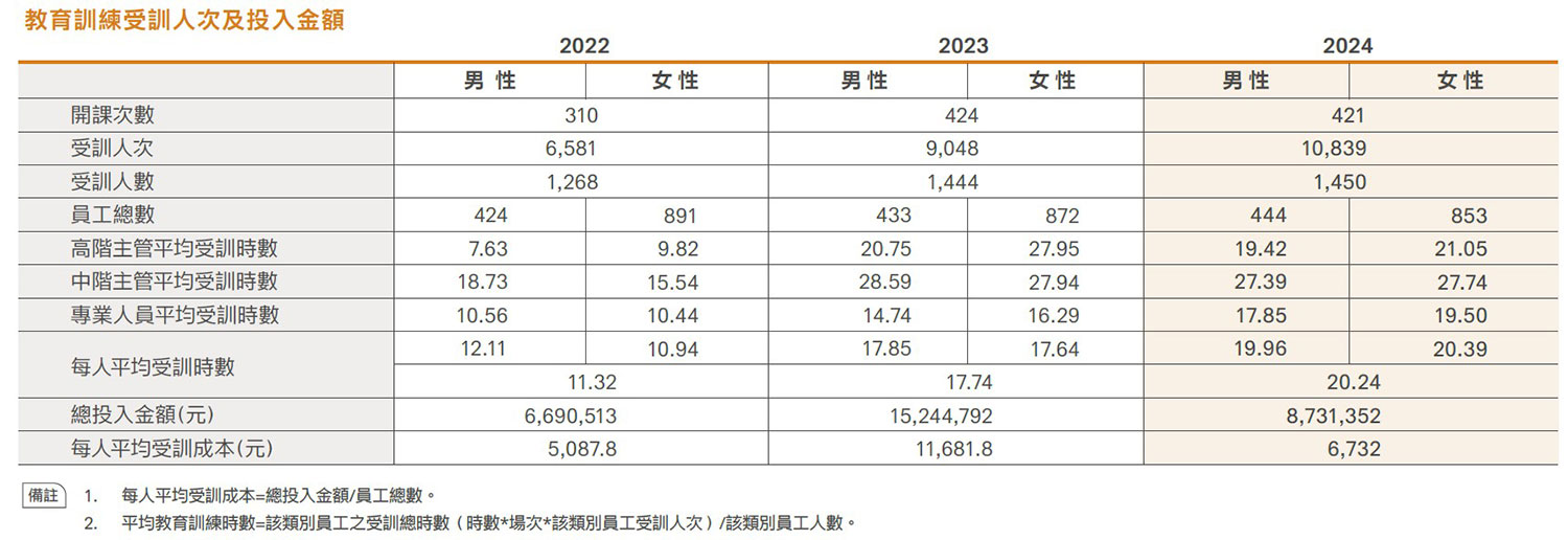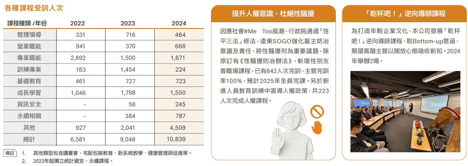 遠東SOGO針對不同部門、職階規劃課程,包含新進訓練、職能、管理及成長學習課程。2024年教育訓練經費投入逾873萬元,平均每人受訓成本6,732元,實際受訓人次提升近2成。
