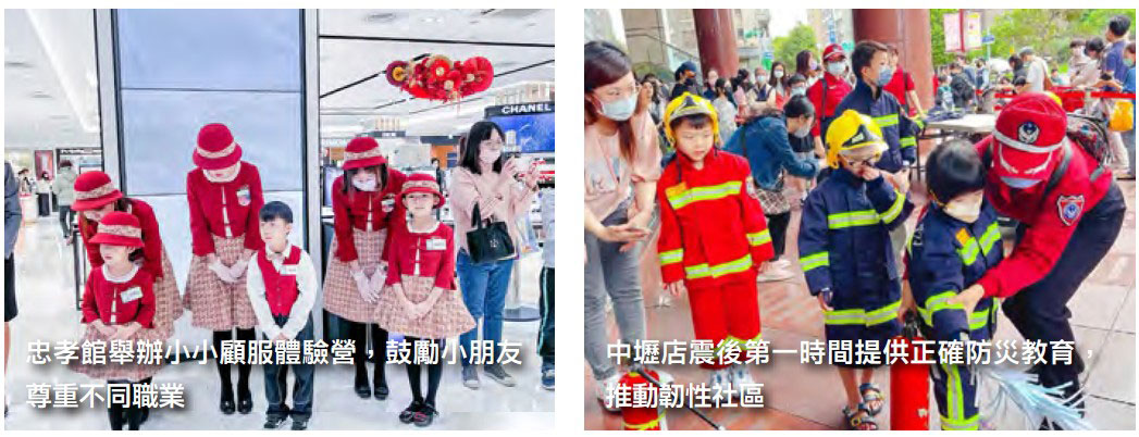 各店善用百貨通路優勢,推出多元職人體驗活動,透過沉浸式體驗與互動,鼓勵兒童多元探索,培養對不同職業的尊重。其中,廣受好評、一開放報名即額滿的「小小顧服卡哇依體驗營」,讓小朋友親身體驗顧客服務的樂趣與挑戰。各店也舉辦多樣職業體驗活動,例如天母店的「小小波麗士體驗營」,透過生動的模擬情境,向兒童傳遞反毒、識詐及交通安全等重要觀念,培養正確的守法意識與犯罪預防觀念。403花東大地震後,中壢店舉辦全台第一場震後應變親子營隊「防災小英雄聯盟體驗營」,透過遊戲闖關方式,讓親子共同學習地震避難、火災逃生、火線出動、濃煙逃生實作 強化家庭安全意識、強化應變能力。
