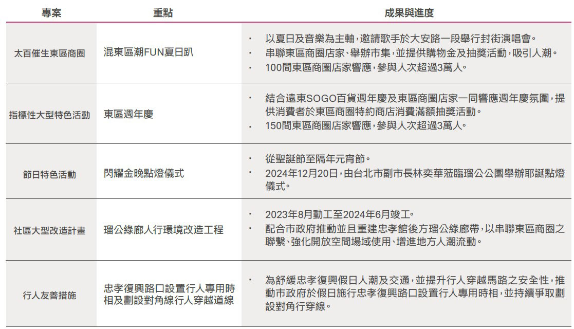 自2019年起,本公司履行企業社會責任,以「創意、創新、創業、創生」為核心策略,推動商圈發展,促成「臺北市東區商圈發展協會」的成立。為振興東區,本公司積極向台北市政府爭取各項資源,2024年7月正式完成東區「瑠公綠廊」改造,優化原本狹長且不便的行走動線,導入無障礙設施與多功能活動空間,增設植栽綠地與休憩座椅,不僅提供舒適的逛街場域,提升東區商圈吸引力,更形塑都市生態綠洲,呼應過去塯公圳水文特色,以綠色廊帶及共融設施,為都市創建綠意與風廊,減緩都市熱島效應;瑠公綠廊完工後,遠東SOGO策劃東區廊帶年度活動,邀集商圈店家共同參與,透過跨品牌合作與節慶行銷,活絡商圈經濟。