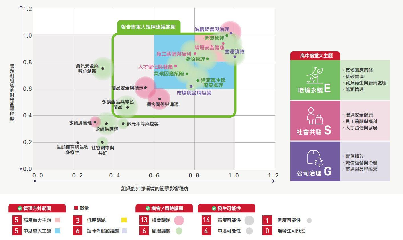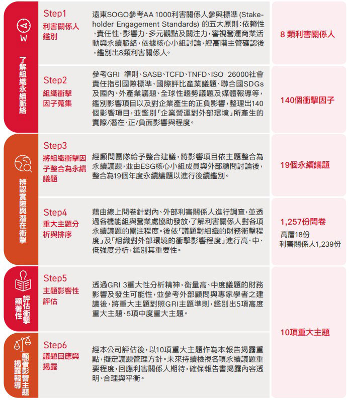 永續議題與利害關係人之鑑別與管理,是推展ESG的核心基礎。遠東SOGO於每年編製企業永續報告書時,皆透過ESG執行秘書小組參考全球永續性報導標準與框架,參照百貨零售業之產業特性,依據AA1000:2018當責性原則之「包容性、重大性、回應性、衝擊性」,以及利害關係人包容性進行鑑別、分析、排序等管理流程。
