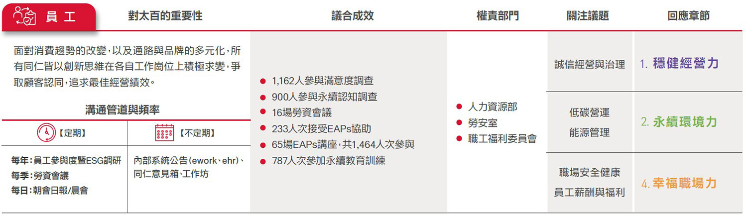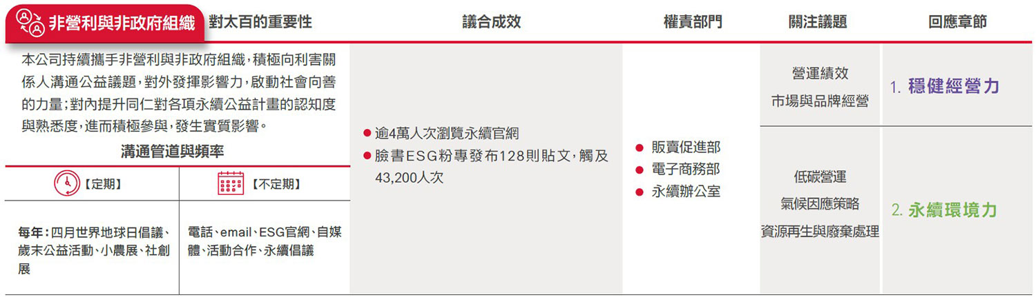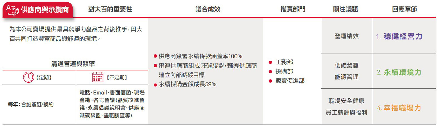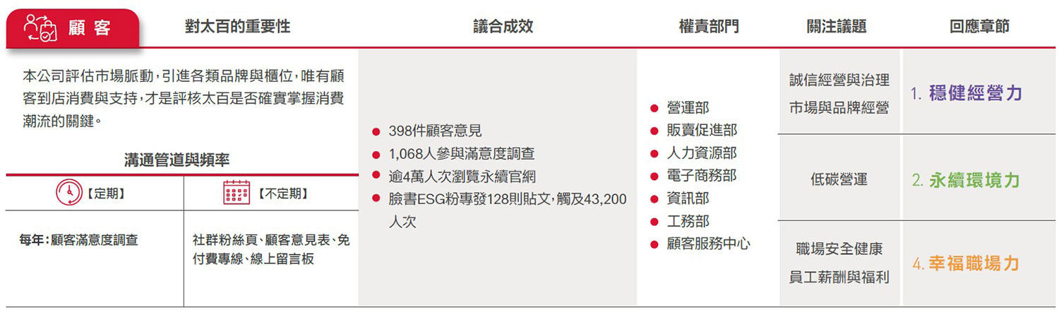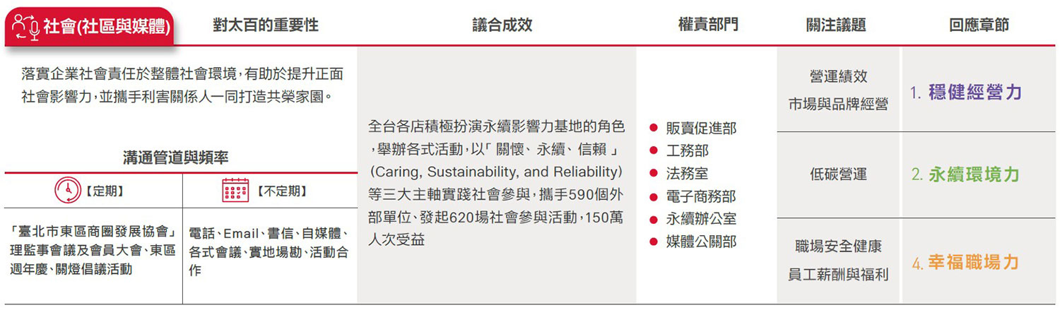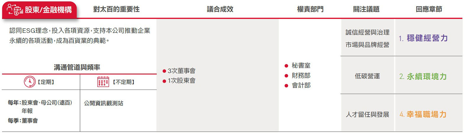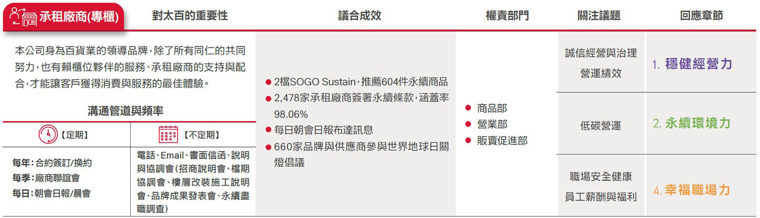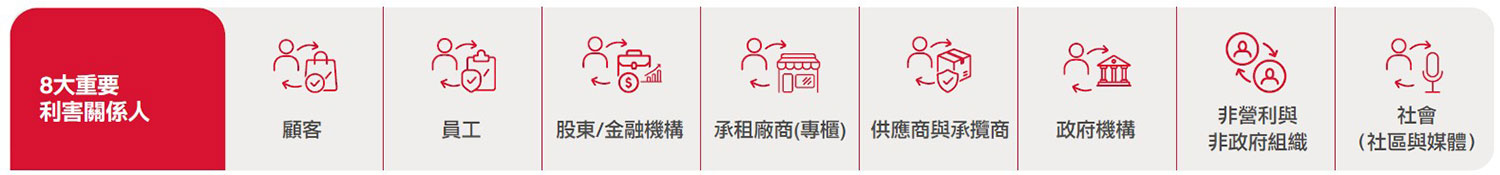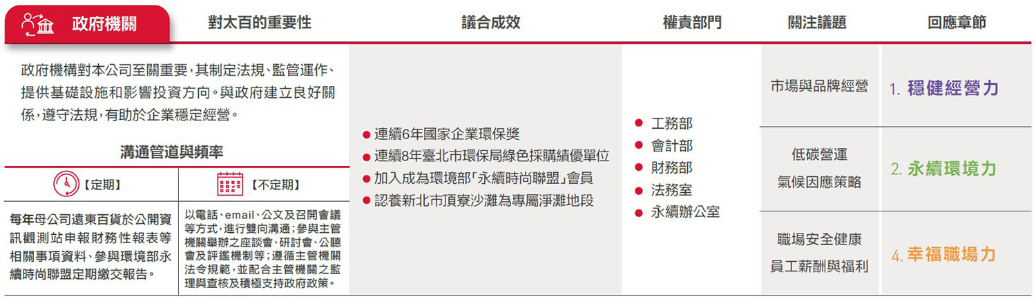 遠東SOGO ESG委員會參考AA1000 SES利害關係人議合標準(Stakeholder Engagement Standard, SES, 2011)之「責任、依賴性、影響力、多元觀點、張力」5大原則,由副總、營運據點店長及協理級以上主管,鑑別出顧客、員工、股東/金融機構、承租廠商(專櫃)、供應商與承攬商、政府機構、非營利與非政府組織、社會(社區與媒體)之公司永續發展過程中8大重要利害關係人,並藉此深化議合過程,強化本公司永續發展策略,且提升社會當責性。